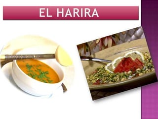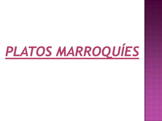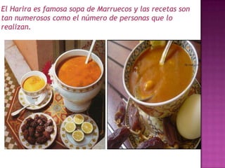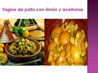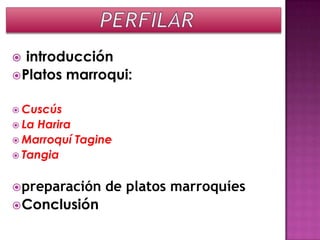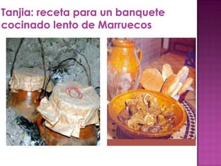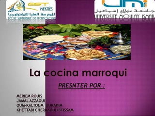 El documento describe la cocina marroquí y sus platos más populares como el cuscús, la harira, el tajine y el tanjia. Explica que la cocina marroquí se caracteriza por su diversidad debido a las diferentes culturas que han convivido en Marruecos y que suele ser casera. Además, detalla los ingredientes y métodos de preparación típicos de estos platos.