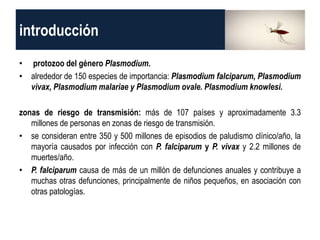 Este documento describe la malaria, un parásito transmitido por mosquitos que infecta a cientos de millones de personas anualmente y causa millones de muertes. La malaria es causada por especies de Plasmodium y se transmite principalmente en África subsahariana. Los síntomas incluyen fiebre y otros síntomas generales. Puede complicarse y causar daño orgánico o la muerte. El tratamiento incluye medicamentos como la cloroquina y la primaquina, mientras que las medidas de control son los mosquiteros tratados con insecticida y