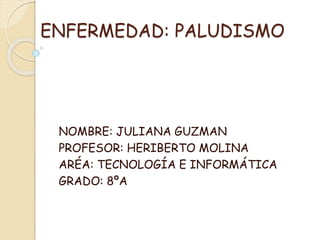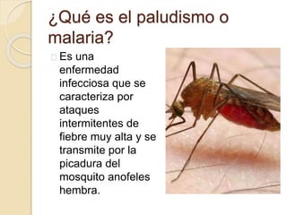 El documento proporciona información sobre la enfermedad del paludismo o malaria. Explica que se trata de una enfermedad infecciosa transmitida por la picadura del mosquito anofeles hembra, la cual causa ataques de fiebre alta. Además, detalla los síntomas, tratamientos, formas de prevención como evitar picaduras de mosquitos o tomar medicamentos preventivos, y el desarrollo de vacunas. Finalmente, ofrece datos epidemiológicos sobre la alta prevalencia de casos y muertes a n
