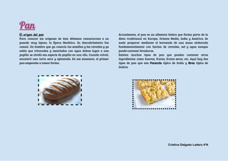 El pan tiene sus orígenes en la Edad de Piedra, cuando un hombre olvidó una papilla de cereales y agua en una olla y al volver la encontró convertida en una torta seca. Actualmente, el pan es un alimento básico en muchas culturas y se prepara horneando una masa a base de harina de cereales, sal y agua, aunque puede contener otros ingredientes. Algunos ejemplos de pan son la focaccia italiana y la broa gallega.