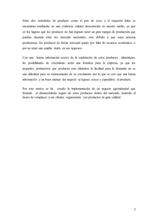 Este documento describe dos productos alimenticios, el pan de coco y el requesón dulce. Explica que actualmente estos productos no se ofrecen en el municipio de Rivas debido a que son desconocidos culturalmente. Se realizaron encuestas a distribuidores minoristas y consumidores para determinar la demanda potencial. Los resultados mostraron que los distribuidores estarían dispuestos a ofrecer los productos si un proveedor los abasteciera de manera confiable, y que los consumidores estarían abiertos a probarlos. El objetivo es