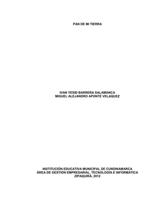 Este documento presenta el plan de negocios de la empresa "Pan de mi tierra", la cual se dedicará a la producción y comercialización de pan artesanal en Zipaquirá, Cundinamarca. En primer lugar, se describen los antecedentes del proyecto y la selección de la idea de negocio. Luego, se realiza un análisis del entorno del mercado, la competencia, las fortalezas y debilidades de la empresa. Además, se detallan los planes operativo, de comercialización y financiero, incluyendo proyecciones de
