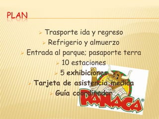 El documento proporciona información sobre un viaje al Parque Nacional de la Cultura Agropecuaria (PANACA). El plan incluye transporte, refrigerio, entrada al parque con un pase llamado "Pasaporte Terra", tarjeta médica y guía. El parque cuenta con 10 estaciones temáticas y 5 exhibiciones sobre ganadería, especies menores, porcicultura y más. Se recomienda llevar ropa cómoda y está prohibido el alcohol.