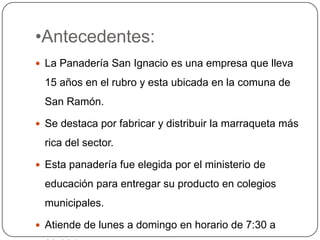 La panadería San Ignacio lleva 15 años ofreciendo pan en la comuna de San Ramón. A pesar de su trayectoria, no tiene presencia digital ni redes sociales, lo que ha limitado su crecimiento. El objetivo es introducirla en el mercado web a través de una página y redes, para mantener informados a los clientes, ampliar su alcance e impulsar nuevas oportunidades de negocio.