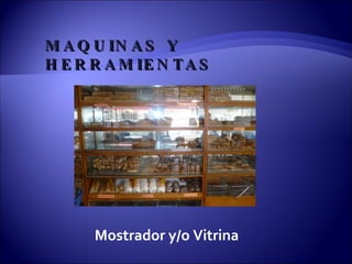 El documento lista y describe maquinaria y herramientas utilizadas en panaderías y pastelerías, incluyendo mostradores, tajadoras de pan, bandejas para enfriamiento, hornos, cuartos de crecimiento, mesas para preparación, amasadores, batidoras y rodillos.