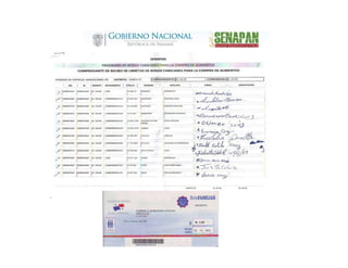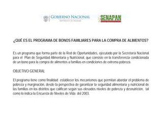Este documento describe un programa de bonos familiares para la compra de alimentos en Panamá. El programa tiene como objetivo reducir la desnutrición y mejorar el acceso a alimentos de familias en pobreza extrema. Se entregan bonos de $100 cada dos meses a familias después de un censo. Las familias deben cumplir con compromisos de salud y educación. El programa también promueve la producción local de alimentos. Más de 11,000 familias en 6 distritos reciben bonos a través de 188 tiendas participantes.