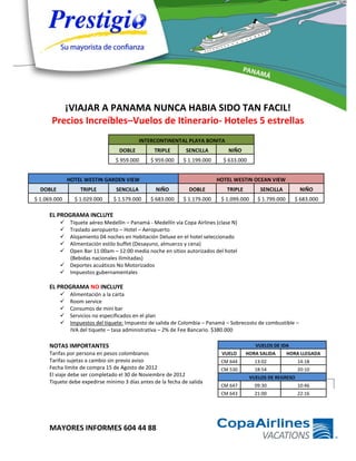 Este documento ofrece paquetes de viaje a Panamá en dos hoteles de 5 estrellas, el Intercontinental Playa Bonita y el Westin Garden View y Ocean View, a precios desde $959.000 pesos colombianos por persona. Los paquetes incluyen vuelos ida y vuelta entre Medellín y Panamá, traslados, alojamiento de 4 noches, comidas y bebidas ilimitadas. La fecha límite para la compra es el 15 de agosto de 2012 y los viajes deben completarse antes del 30 de noviembre de 2012.