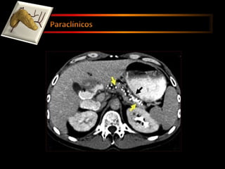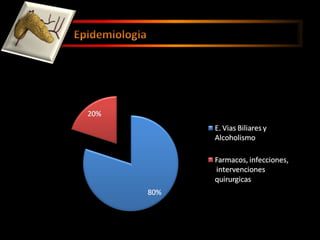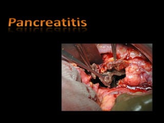 La pancreatitis puede ser aguda o crónica. La aguda implica un solo episodio inflamatorio que generalmente se resuelve solo, mientras que la crónica causa daño permanente debido a la inflamación repetida y fibrosis. Las causas más comunes son cálculos biliares y consumo excesivo de alcohol a largo plazo. Los síntomas incluyen dolor abdominal agudo y otras complicaciones graves en algunos casos. El tratamiento consiste en ayuno, analgésicos, sueros y tratamiento de complicaciones. La crónica se caracteriza por fibrosis e insuficiencia