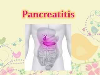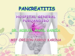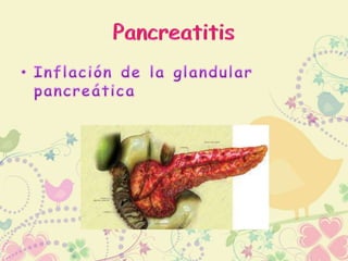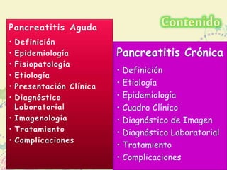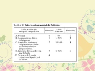 El documento proporciona información sobre la pancreatitis aguda. En resumen: (1) La pancreatitis aguda puede ser leve o grave dependiendo de la presencia de complicaciones como necrosis o fallo de órganos. (2) Los factores de riesgo incluyen litiasis biliar, alcoholismo y traumatismos abdominales. (3) El tratamiento depende de la gravedad e incluye medidas de soporte, analgesia y en casos graves cirugía o endoscopia.