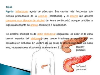 La pancreatitis es la inflamación del páncreas, que puede ser aguda o crónica. La aguda generalmente implica un solo episodio del que el paciente se recupera, mientras que la crónica causa daño permanente al órgano. Las causas más comunes son cálculos biliares, alcoholismo y exceso de grasas. Los síntomas incluyen dolor abdominal, náuseas y vómitos. El tratamiento de la aguda involucra ayuno, sueros y analgésicos, mientras que la crónica requiere abandonar el alcohol y