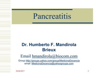 Este documento presenta información sobre la pancreatitis aguda, incluyendo su definición, etiología, síntomas, diagnóstico, tratamiento y complicaciones. La pancreatitis aguda es una inflamación del páncreas causada por la activación de enzimas pancreáticas que digieren la glándula, lo que puede causar desde una enfermedad leve hasta una forma grave e incluso mortal. El diagnóstico se basa en el historial clínico, exámenes bioquímicos y de imagenología. El tratamiento se enfoca en el alivio de