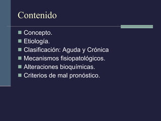 Este documento resume los conceptos clave de la pancreatitis, incluyendo su definición, etiología, mecanismos fisiopatológicos, manifestaciones clínicas, criterios de gravedad y pronóstico. Describe la anatomía y función del páncreas, así como los mecanismos por los cuales la activación prematura de enzimas digestivas conduce a daño pancreático y sistémico en la pancreatitis aguda. También explica las teorías sobre la progresión a pancreatitis crónica debido a episodios repetidos o factores