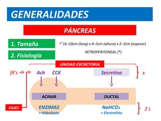 Este documento describe la pancreatitis aguda, una inflamación aguda del páncreas que puede ser leve o severa. Explica su etiología, síntomas, diagnóstico, criterios pronósticos y tratamiento. Se clasifica la gravedad usando los criterios de Ranson y la escala de Balthazar tomográfica. La pancreatitis aguda severa tiene mayor riesgo de complicaciones y mortalidad.