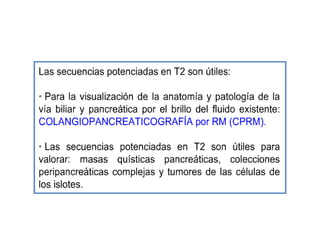 Este documento proporciona información sobre la pancreatitis aguda, incluyendo su definición, tipos, fases, complicaciones, severidad y hallazgos de imagen. Describe la pancreatitis aguda intersticial y necrotizante, así como las fases temprana y tardía. También detalla las complicaciones locales como colecciones pancreáticas y peripancreáticas, y el papel de la tomografía computarizada y resonancia magnética en la evaluación y diagnóstico.