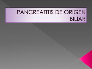 La pancreatitis aguda es una inflamación del páncreas no bacteriana causada por la activación y liberación de enzimas pancreáticas. Puede ser leve o severa, y los factores de riesgo incluyen cálculos biliares, colecistitis crónica y coledocolitiasis. Los síntomas son dolor abdominal, náuseas, vómitos e ictericia. Los exámenes de laboratorio muestran elevación de enzimas pancreáticas, mientras que las imágenes como ecografía y tomografía computarizada confirman el diagn