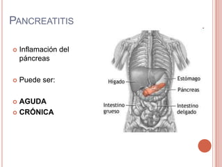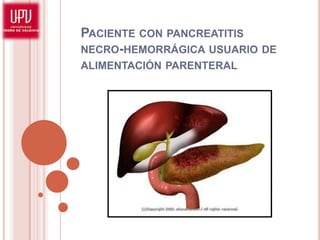 Este documento describe el caso de un paciente de 43 años con pancreatitis necrotizante hemorrágica que requiere alimentación parenteral. El paciente presenta dolor abdominal severo, ictericia, signos de shock y elevación de enzimas pancreáticas. Recibe tratamiento con sonda de Blakemore, ligadura de várices, catéter venoso central y nutrición parenteral total. Se diagnostican complicaciones como disminución del volumen intravascular, hipoperfusión tisular y déficit de ingesta, las cuales son monitoreadas de cerca.