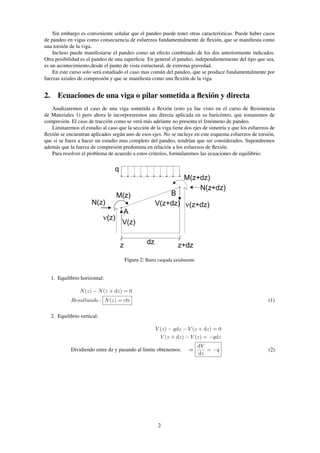 El documento describe el fenómeno de pandeo en columnas y vigas sometidas a compresión axial. Explica que el pandeo causa un desplazamiento lateral no lineal incluso cuando el material se comporta de manera lineal. Deriva las ecuaciones que rigen el comportamiento de una viga sujeta a carga axial y distribuida, y resuelve la ecuación homogénea para obtener la solución de Euler para la carga crítica de pandeo. Señala las limitaciones del análisis de Euler para desplazamientos mayores.