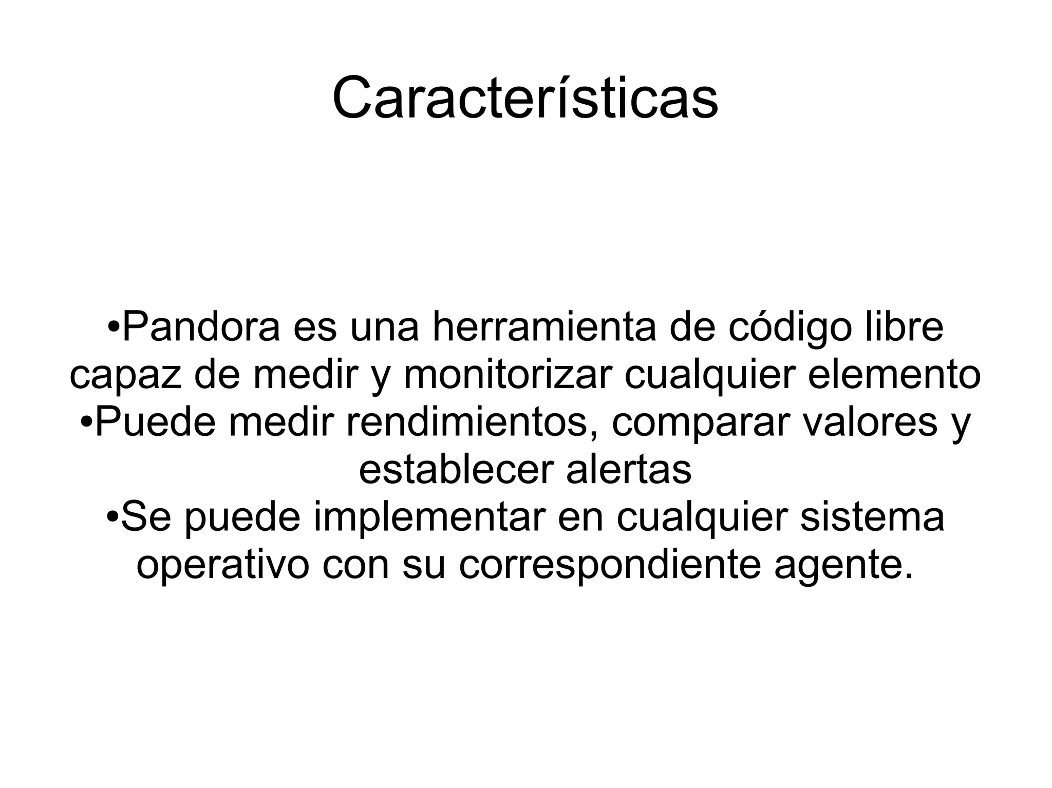 Pandora es una herramienta de código abierto que permite medir y monitorear cualquier elemento en cualquier sistema operativo. Se puede instalar descargando una imagen ISO o un disco duro virtual. La configuración básica es sencilla e intuitiva. Ofrece vistas de grupos de agentes, mapas de red, estadísticas de incidentes, eventos del servidor, y permite gestionar agentes, grupos, alertas, usuarios y más.