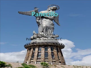 El documento describe la Virgen del Panecillo, una estatua ubicada en la cima del cerro Panecillo en Quito, Ecuador. También menciona la Olla del Panecillo, una cisterna construida por los españoles cerca de la cima. Además, presenta algunas leyendas sobre el cerro, incluyendo una sobre un templo de oro construido por el Inca Atahualpa.
