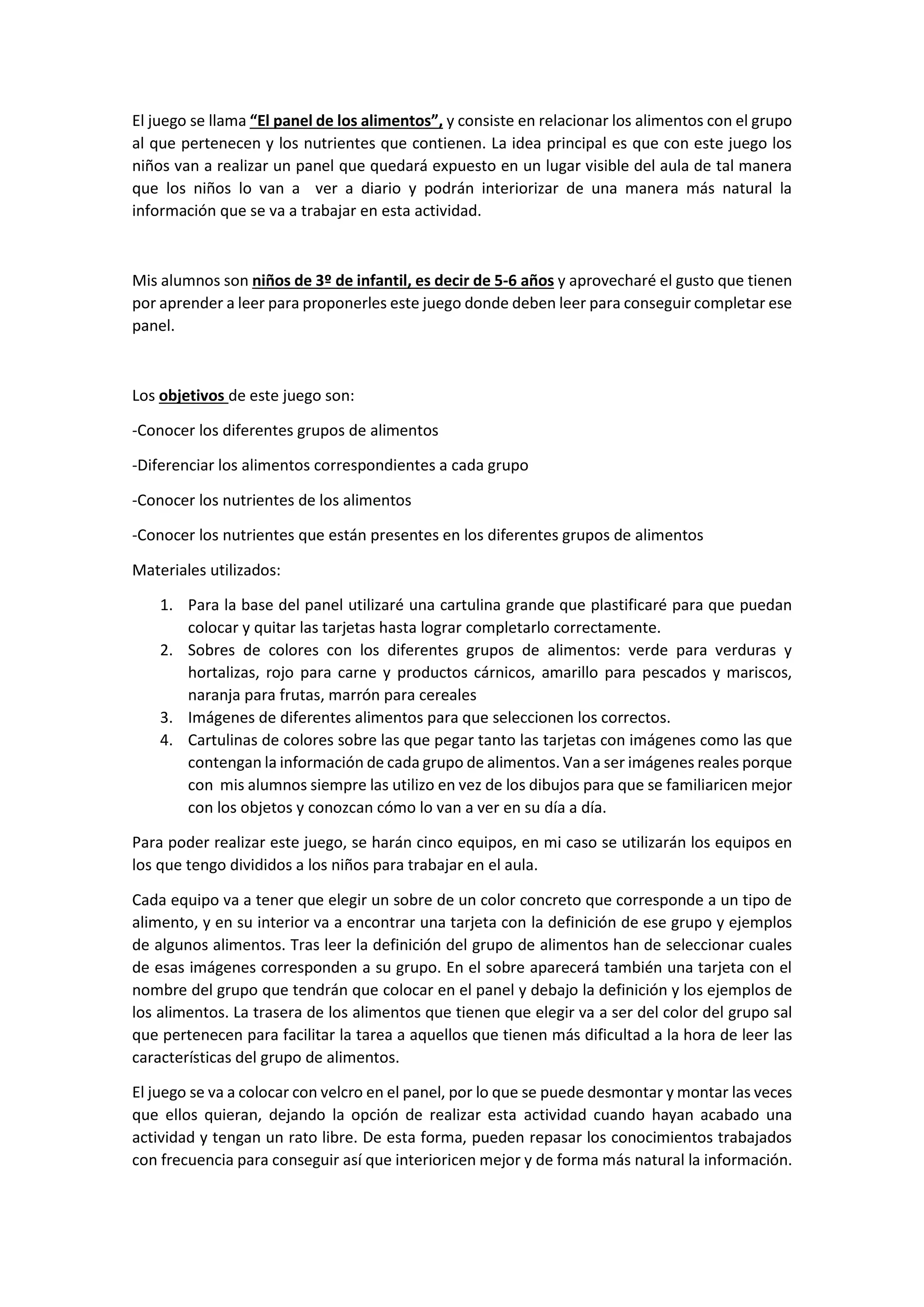 Este juego busca enseñar a niños de 5-6 años sobre los grupos de alimentos y sus nutrientes. Los niños formarán equipos y usarán tarjetas e imágenes para completar un panel que muestra cada grupo de alimentos y sus características. El objetivo es que los niños aprendan de forma natural reconociendo los alimentos y repitiendo la actividad.