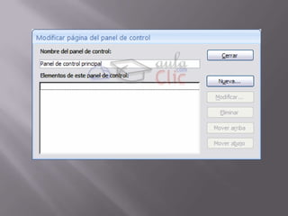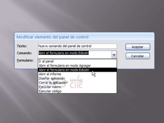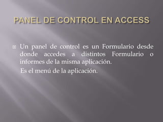 Este documento describe cómo crear y configurar un panel de control en Microsoft Access para mejorar la interfaz de usuario de una base de datos. Explica que un panel de control permite acceder a diferentes formularios e informes a través de botones de comando y constituye el menú principal de la aplicación. Detalla el proceso de creación de páginas, elementos y opciones de comando en el Administrador del panel de control para organizar y lanzar los diferentes componentes de la base de datos.