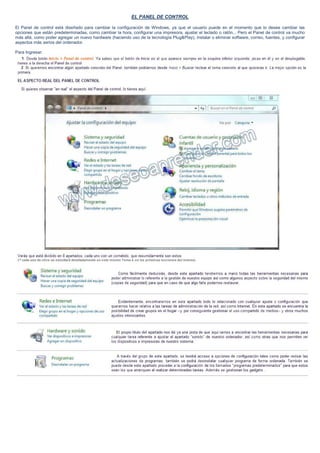El Panel de control permite a los usuarios cambiar configuraciones predeterminadas como la fecha y hora, e instalar o eliminar hardware y software. Incluye opciones para agregar o quitar programas, configurar el firewall, mouse, pantalla, y más. También permite restaurar archivos de una copia de seguridad y administrar dispositivos, redes, e impresoras.