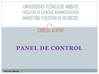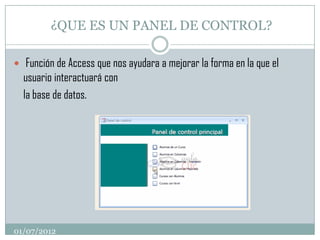 Este documento explica cómo crear y configurar un panel de control en Access. Un panel de control permite organizar el acceso a formularios e informes de una base de datos mediante la creación de páginas y elementos. Para crearlo se debe pulsar el botón Administrador del panel de control y luego agregar elementos que enlacen a formularios, informes u otras acciones. Las páginas y elementos se almacenan en la tabla Swichboard Items de la base de datos.