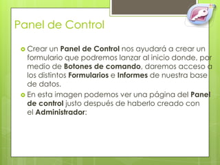El documento describe el proceso para crear un panel de control en Access, permitiendo acceso a formularios e informes de una base de datos. Se detalla cómo configurar los elementos que aparecerán en el panel y organizar las opciones en varias páginas para mejorar su manejo. Además, se explica cómo establecer una página como predeterminada y eliminar páginas no necesarias.