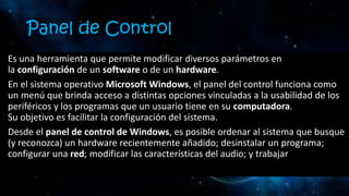 El Panel de Control de Windows es una herramienta que permite configurar diversos aspectos del hardware y software del sistema operativo. Desde el Panel de Control, los usuarios pueden modificar opciones de red, sonido, cuentas de usuario, programas instalados, y configuraciones de seguridad y rendimiento, entre otros. Su objetivo principal es facilitar la administración y personalización del sistema a través de un menú centralizado.