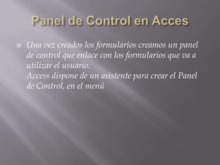 Este documento describe cómo crear un panel de control en Microsoft Access para que los usuarios puedan navegar fácilmente por los formularios y informes de una base de datos. Explica los pasos para utilizar el asistente para crear páginas como "Formularios" y "Informes", y luego editar la página principal para añadir elementos que enlacen a estas páginas y una opción para cerrar la aplicación. El objetivo final es proporcionar una interfaz amigable para que los usuarios exploren y gestionen los datos almacenados en
