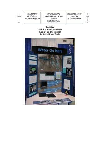 El documento proporciona sugerencias para crear un panel de presentación efectivo para un proyecto de feria de ciencias. Recomienda usar encabezados claros y gráficos legibles, asegurarse de que la exhibición refleje solo el trabajo del año en curso, y tener un título atractivo que capture el interés. También sugiere tomar fotografías cuando sea relevante, organizar la exhibición de manera lógica y llamativa, y seguir las pautas oficiales.