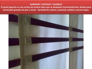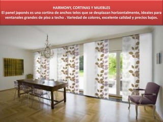El documento describe el panel japonés, una cortina de tela ancha que se desliza horizontalmente y es ideal para grandes ventanales de piso a techo. Ofrece una variedad de colores, excelente calidad y precios bajos.