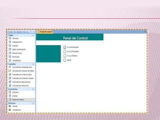Este documento describe cómo crear formularios y paneles de control en Access. Explica que los formularios permiten ver, editar y agregar datos de tablas y consultas de manera controlada. Detalla tres métodos para crear formularios y describe cómo crear un panel de control configurando elementos como botones para abrir tablas u ejecutar macros de forma dinámica en varias páginas.