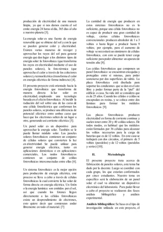 El documento describe un proyecto de construcción de un panel solar para suministrar energía al laboratorio 1 de la Universidad Técnica de Machala. El proyecto incluyó una investigación bibliográfica sobre paneles solares y dos pruebas experimentales para construir un panel, la primera con materiales caseros y la segunda con celdas fotovoltaicas comerciales. La segunda prueba tuvo éxito al generar 5-6 voltios en un circuito en paralelo y alimentar bombillas de 6 y 12 voltios.