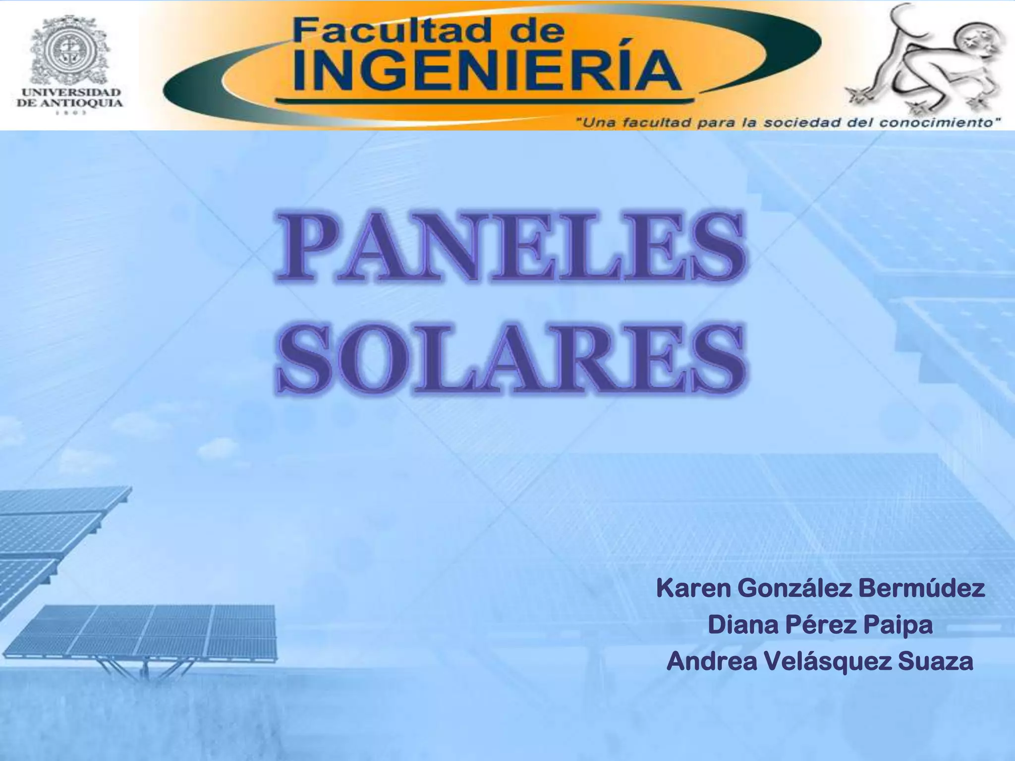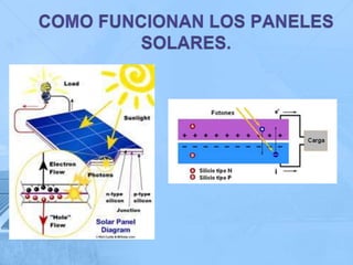1) Los paneles solares convierten la energía luminosa del sol en energía eléctrica mediante el efecto fotovoltaico. 2) Están compuestos principalmente de celdas fotovoltaicas de silicio que generan corriente eléctrica cuando son expuestas a la luz. 3) Los paneles solares proveen una fuente de energía renovable y limpia que tiene múltiples aplicaciones como calentar agua, bombear agua, iluminación y recargar dispositivos electrónicos portátiles.