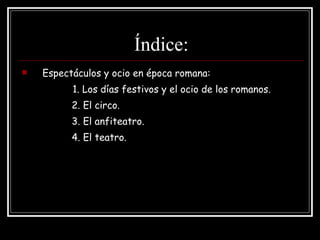 El documento describe los principales espectáculos y lugares de ocio en la época romana, incluyendo el circo, donde se realizaban carreras de carros; el anfiteatro, escenario de luchas de gladiadores y combates con animales; y el teatro, donde se representaban obras. Explica aspectos como las diferentes partes de estos edificios y los espectáculos que albergaban, así como ejemplos notables como el Circo Máximo y el Coliseo de Roma.