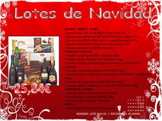 El documento presenta varios lotes de productos navideños para la venta, incluyendo vinos, licores, turrones, dulces, conservas y otros artículos. Se ofrecen descuentos por volumen de compra y se incluye un sorteo de un gran lote para compras superiores a 10€.