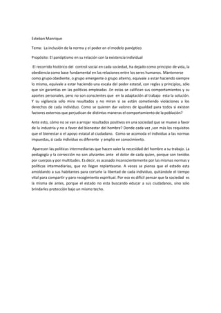 Este documento discute cómo el modelo panóptico de control social puede perjudicar a los individuos al imponer normas y poder de forma desigual. Argumenta que aunque el estado intenta mantener la obediencia a través de reglas y políticas, estas a menudo no toman en cuenta las diferencias individuales y pueden violar los derechos de las personas. También sugiere que el enfoque actual está más enfocado en la industria que en el bienestar de los ciudadanos, lo que dificulta que los individuos se ajusten a las normas impuestas.