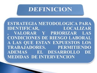 El documento presenta una metodología para identificar, valorar y priorizar los riesgos laborales, facilitando la elaboración de un programa de salud ocupacional. Se analizan factores de riesgo como eléctricos, químicos, biológicos y psicosociales, estableciendo un sistema de evaluación que considera la gravedad de las consecuencias, la exposición y la probabilidad de ocurrencia. Además, se propone un plan de intervención para mitigar estos riesgos y un sistema de seguimiento para evaluar su efectividad.