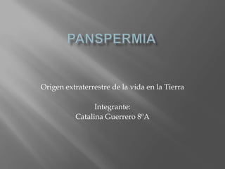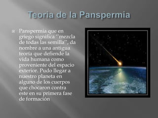 La teoría de la panspermia sugiere que la vida en la Tierra provino del espacio exterior, llegando en cuerpos que chocaron con el planeta en su formación inicial. Fue propuesta en 1908 por el químico sueco Svante Arrhenius y apoyada por el astrónomo Fred Hoyle. Aunque algunos estudios apoyan que las bacterias podrían sobrevivir en el espacio, la teoría no explica el origen inicial de la vida y las bacterias podrían no sobrevivir al impacto con la Tierra.