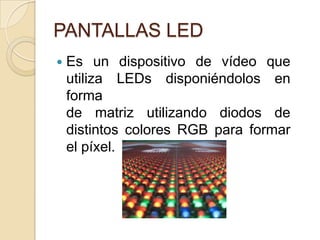 El documento habla sobre diferentes tipos de pantallas LED y 3D. Explica que las pantallas LED usan matrices de LEDs de colores RGB para formar píxeles y ofrecer alta resolución. También describe pantallas LED para interiores y exteriores, siendo las exteriores más brillantes. Finalmente, cubre sistemas estereoscópicos y autoestereoscópicos para visualizar contenido 3D, necesitando las primeras gafas y las segundas no.