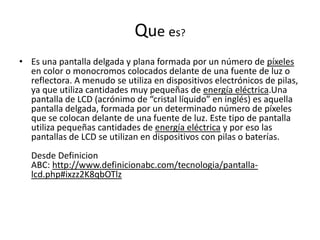 Una pantalla LCD (cristal líquido) es una pantalla delgada y plana formada por píxeles colocados delante de una fuente de luz. Funciona usando moléculas de cristal líquido entre capas polarizadas, permitiendo mostrar imágenes. Un televisor LCD consta de reflectores, paneles polarizados, cristal líquido y filtro de color RGB iluminados por lámparas o LEDs.
