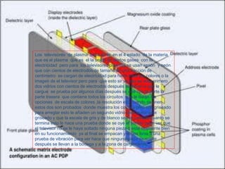 Los televisores de plasma funcionan mediante el uso del cuarto estado de la materia, el plasma, el cual se crea al cargar electrodos de xenón y neón con electricidad para formar imágenes. El proceso de fabricación involucra la creación de dos vidrios con electrodos que son probados y unidos con circuitos, luego añadiéndose un segundo vidrio para mejorar la calidad de imagen y sonido antes de empacarse y probarse para su funcionamiento y resistencia a vibraciones.