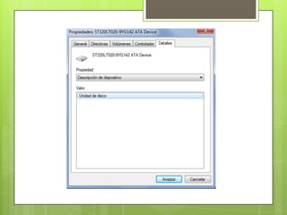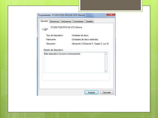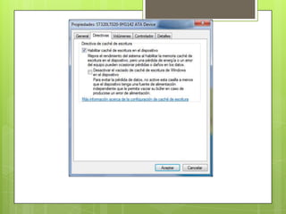 Este documento describe las opciones de configuración disponibles en la pantalla de propiedades de un dispositivo. Se puede habilitar la memoria cache de escritura para mejorar el rendimiento, aunque esto puede causar pérdidas de datos si hay una falla de energía o equipo. Las pestañas disponibles son GENERAL, REGION DVD, VOLUMENES, CONTROLADOR Y DETALLES. La pestaña donde se pueden configurar propiedades es OPCIONES AVANZADAS, donde se puede configurar la activación con apagado.