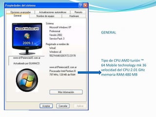 Este documento resume la configuración de una computadora, incluyendo especificaciones como un procesador AMD Turion de 2.01 GHz y 480 MB de RAM. También describe opciones avanzadas como el rendimiento del procesador y uso de memoria, perfiles de usuario, e inicio y recuperación del sistema. Además, proporciona el nombre y grupo de trabajo de la computadora para identificarla en una red.