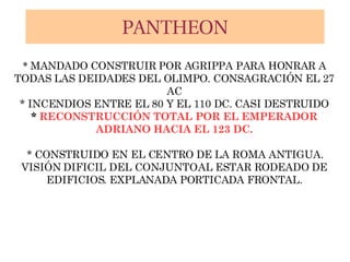 El Panteón de Roma fue mandado construir originalmente por Agripa en el 27 a.C. para honrar a todos los dioses del Olimpo. Sufrió daños por incendios entre los años 80 y 110 d.C. y fue reconstruido completamente por el emperador Adriano hacia el 123 d.C. Tiene una bóveda hemisférica de 43.5 metros de altura decorada con casetones y un oculo en el centro de 9 metros de diámetro que proporciona luz natural al interior.