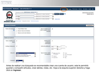 Este documento describe las funciones y características del sistema de descubrimiento EBSCO Discovery Service (EDS) que proporciona acceso a los recursos electrónicos e impresos del Sistema de Bibliotecas UNAB a través de una única interfaz de búsqueda. EDS permite realizar búsquedas simples y avanzadas, filtrar resultados, crear alertas de búsqueda, y guardar y organizar artículos en una carpeta personal. Para acceder a EDS y otros recursos del Sistema de Bibliotecas, los usuarios