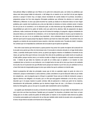 Los principales problemas que enfrentan los alumnos en México incluyen falta de alimentación adecuada, falta de apoyo de los padres, malas condiciones en las escuelas como aulas en el piso y ubicaciones peligrosas. También hay problemas de motivación entre los estudiantes y desmotivación entre los maestros. Además, el sistema sindical dificulta despedir a maestros problemáticos.