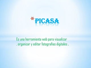 Picasa es una herramienta web gratuita para visualizar, organizar y editar fotografías digitales. Permite cargar imágenes en álbumes web y editar fotos mediante funciones como recortar y eliminar ojos rojos. Originalmente fue creada por una compañía llamada Lifescape en 2002.