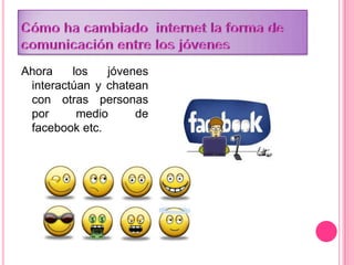 Los jóvenes usan redes sociales como Facebook, Twitter y YouTube para interactuar y chatear con personas de otros países, lo que les permite hacer amigos internacionales y acceder a nuevos círculos sociales. Sin embargo, también existe el riesgo de que hablen con extraños o pasen mucho tiempo en internet en lugar de realizar otras actividades. Los padres deben monitorear el uso que hacen los jóvenes de las computadoras y asegurarse de que no visiten sitios inapropiados o hablen con personas desconocidas.